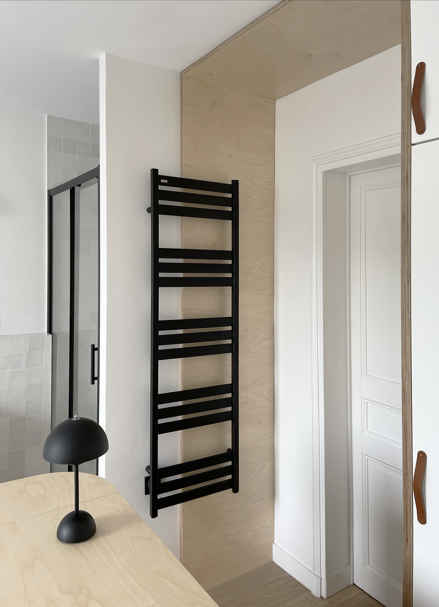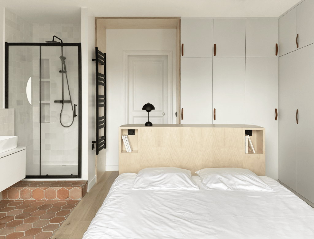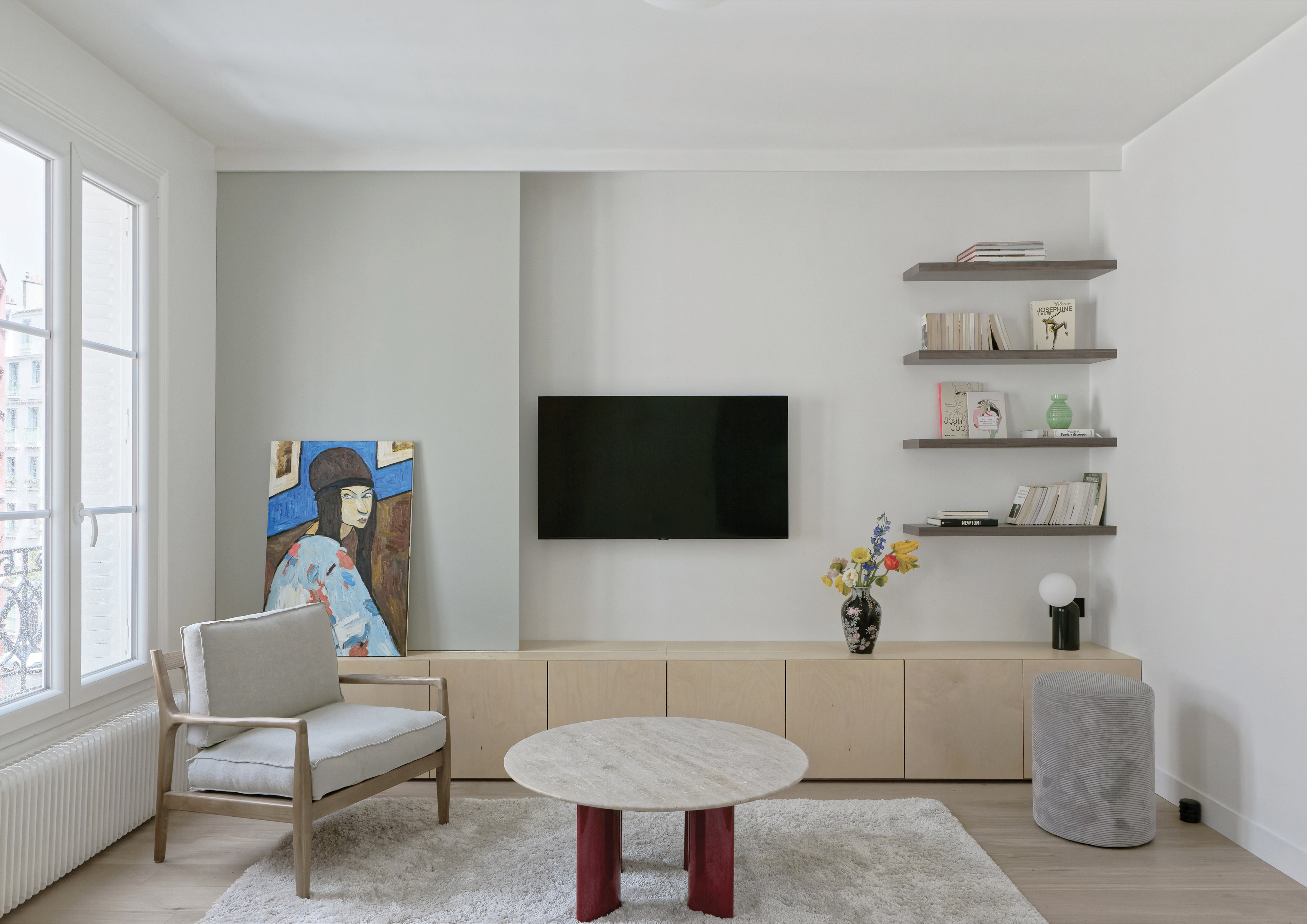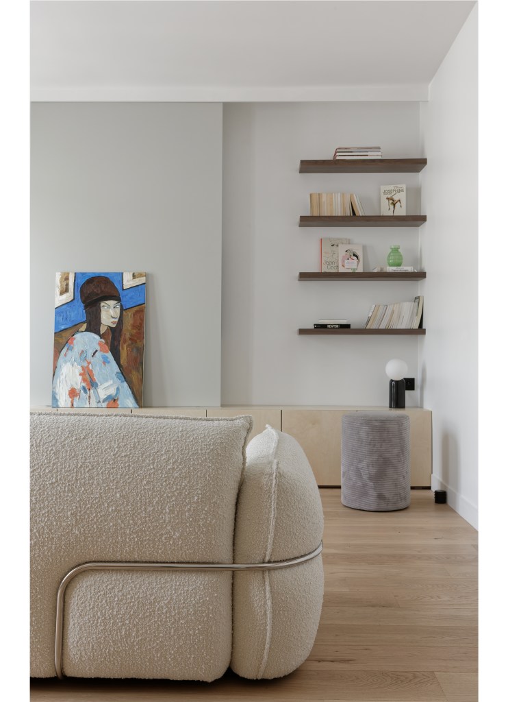 Dans cet espace se dessine la nouvelle cuisine bicolore épurée et ultra fonctionnelle, un salon enveloppant aux teintes douces et au centre du projet, la chambre parentale, imaginée comme une suite d’hôtel d’inspiration méditerranéenne. Un grand nombre d’éléments sur mesure en contreplaqué de bouleau ainsi que des touches de noir servent en fil conducteur à ce projet.