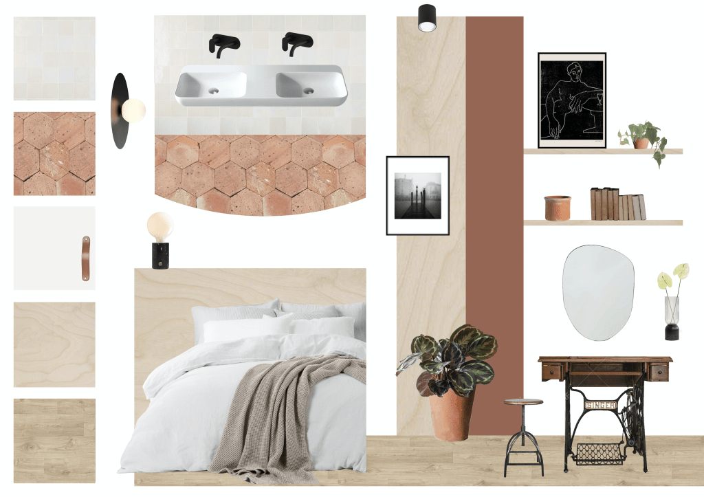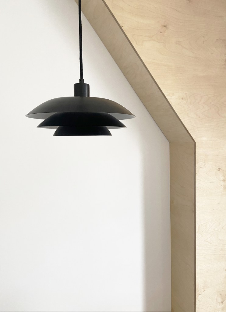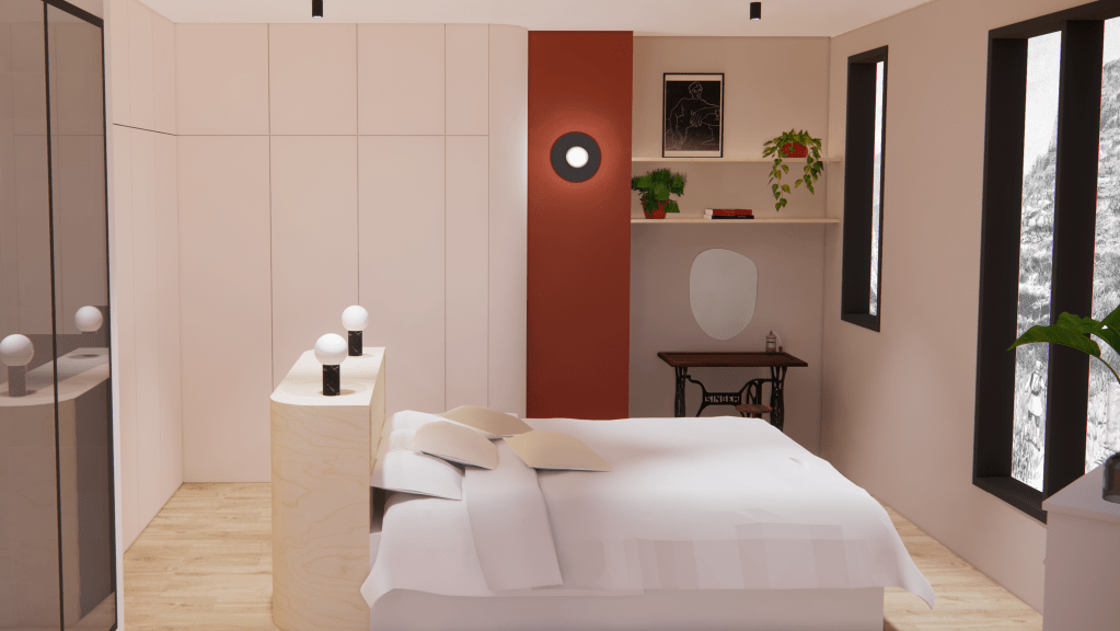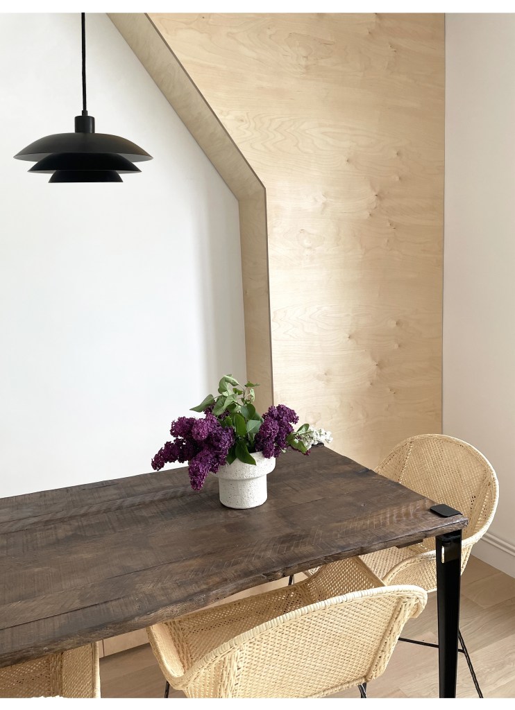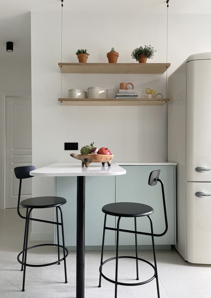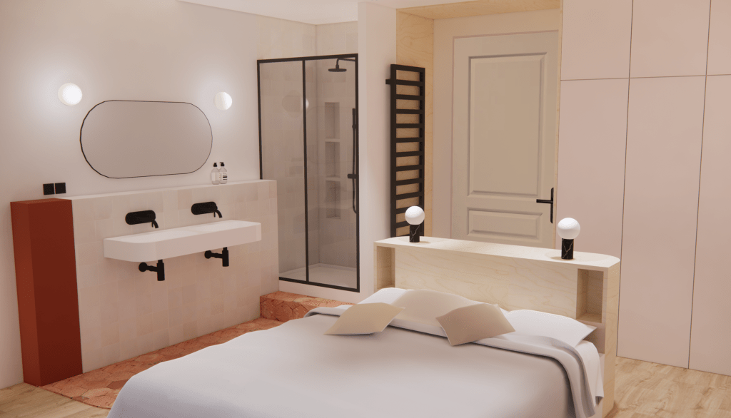 Dans cet espace se dessine la nouvelle cuisine bicolore épurée et ultra fonctionnelle, un salon enveloppant aux teintes douces et au centre du projet, la chambre parentale, imaginée comme une suite d’hôtel d’inspiration méditerranéenne. Un grand nombre d’éléments sur mesure en contreplaqué de bouleau ainsi que des touches de noir servent en fil conducteur à ce projet.
