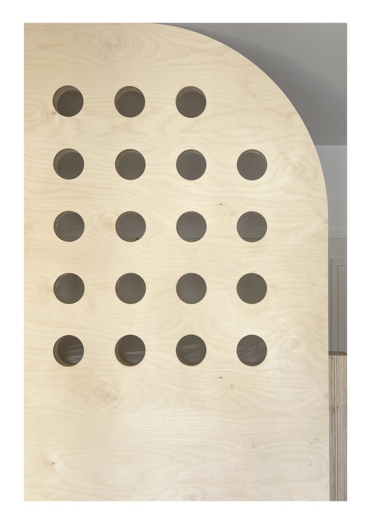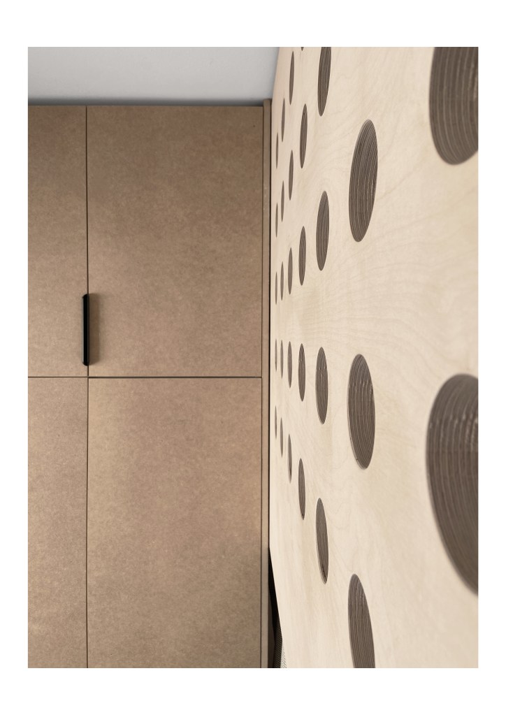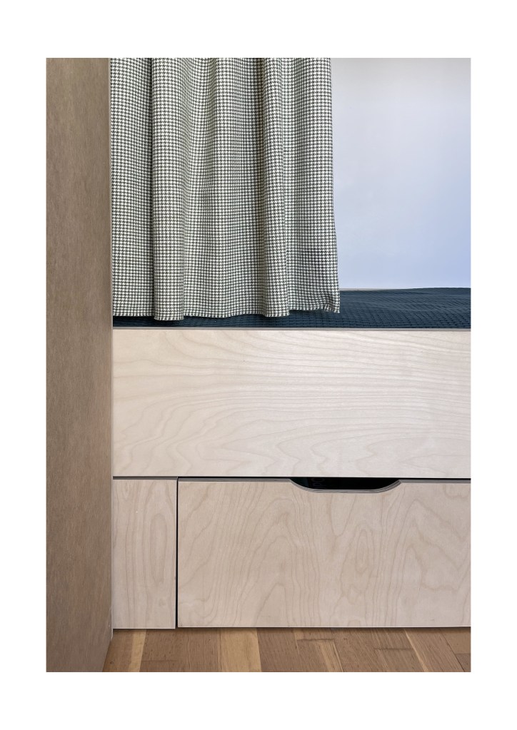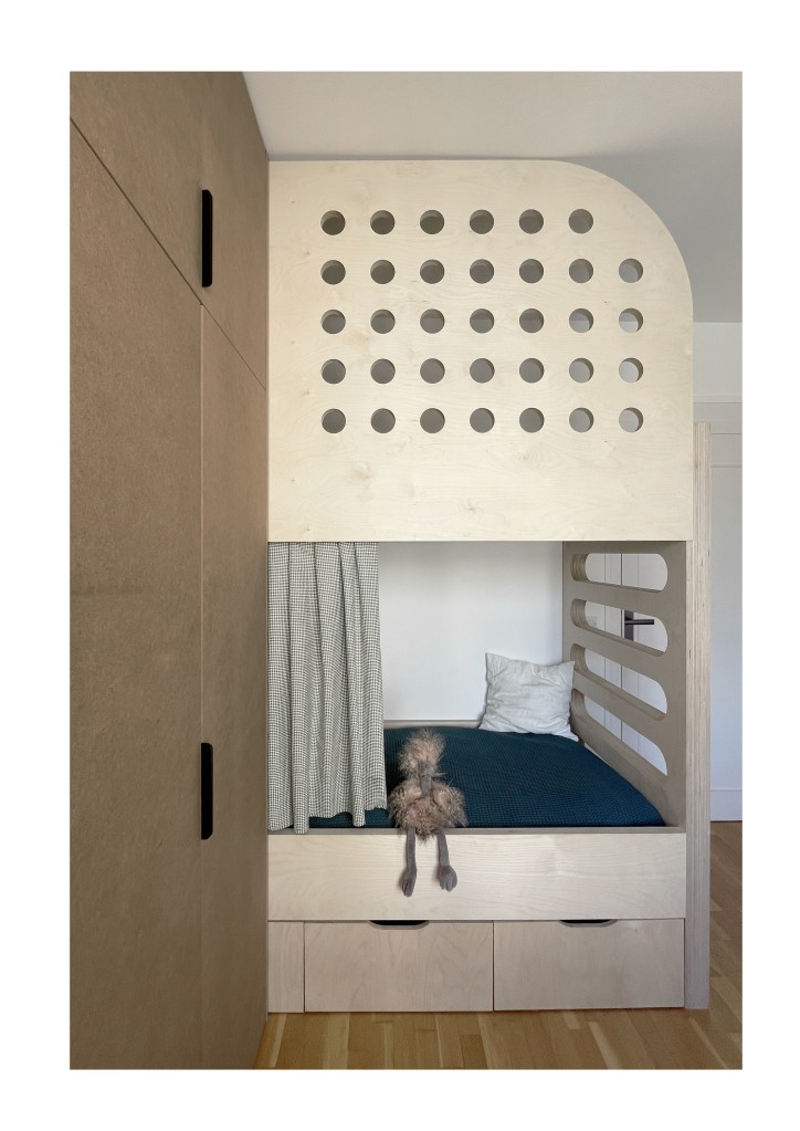 Dans cette chambre d’enfant nous avons conçu un lit superposé tout en courbes doté d’un garde corps imaginé comme un écho aux réalisations de Jean Prouvé. Malgré sa petite superficie, de nombreux rangements sur mesure permettent de dissimuler jouets et vêtements.