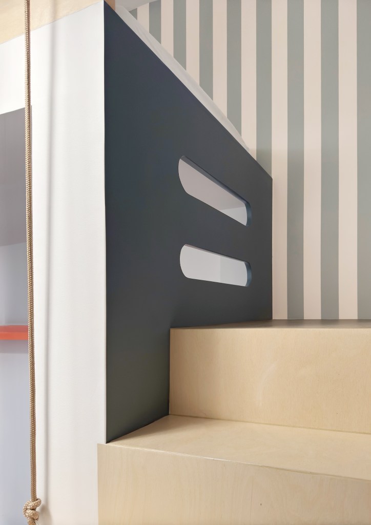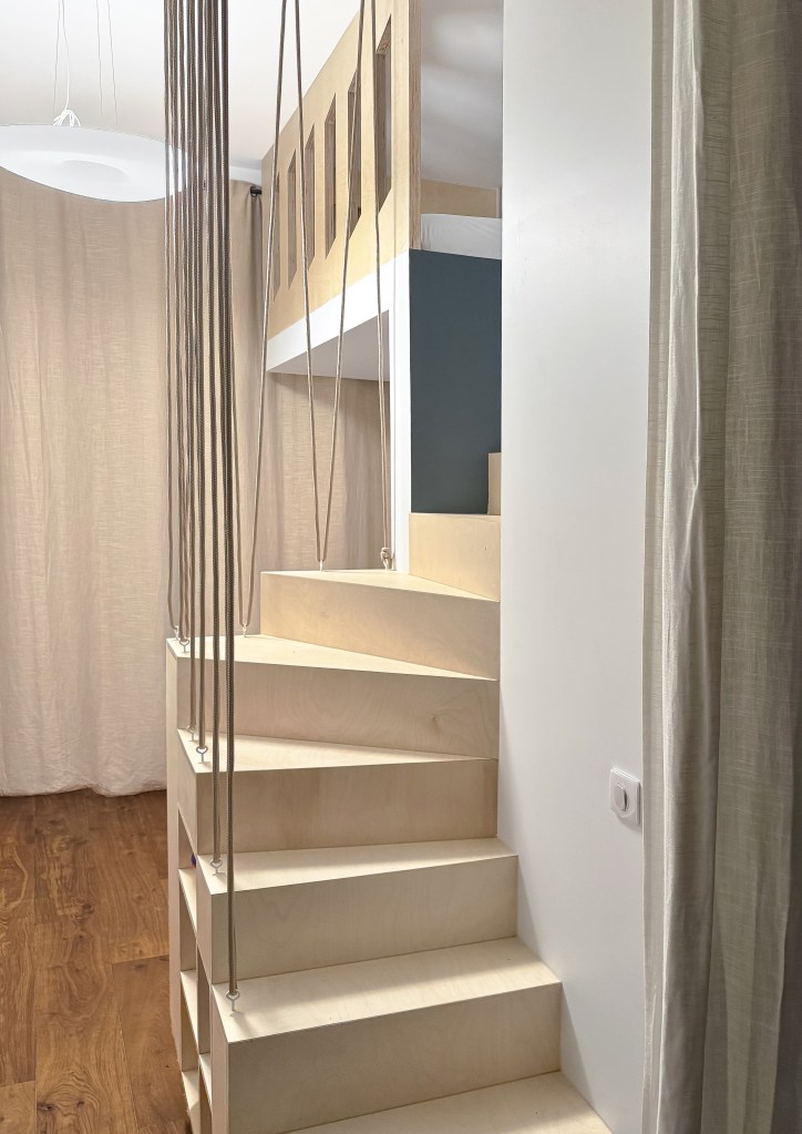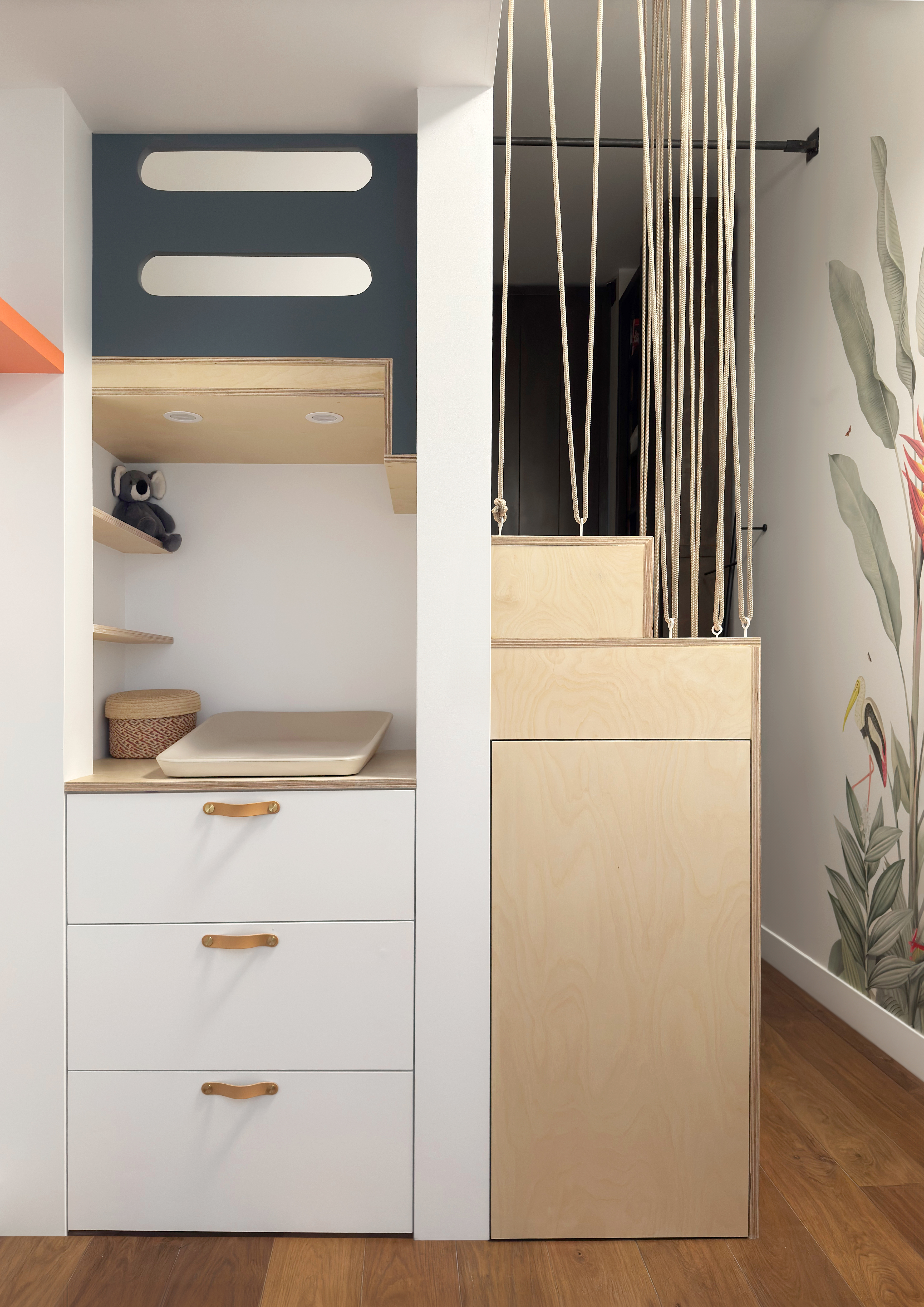 Descriptif : La chambre de Benjamin a été complètement rénovée pour l’arrivée de son petit frère Paul. Une mezzanine 100% sur mesure a été construite, avec d’un côté, une grande penderie toute hauteur et de l’autre, de nombreux rangements intégrés et un espace à langer. Pour la déco, un jeu de papiers-peints à motifs vient habiller les 3,37 mètres de hauteur sous plafond.