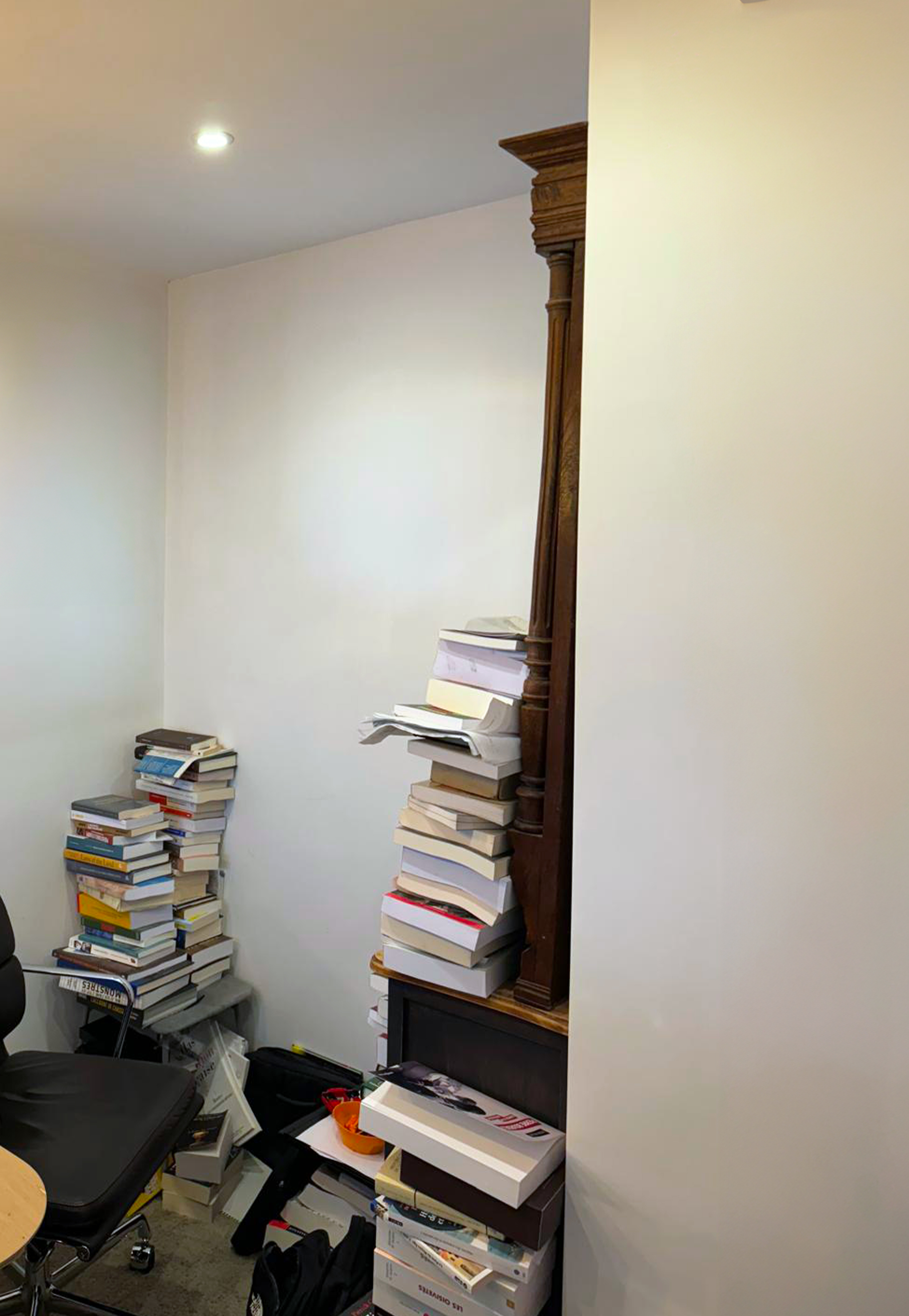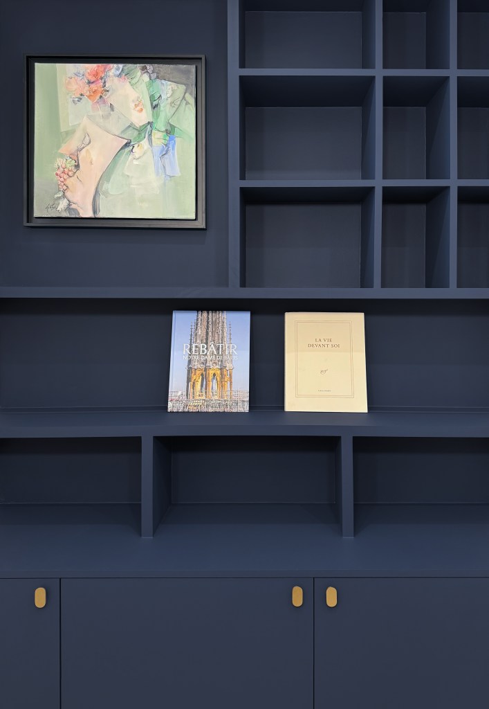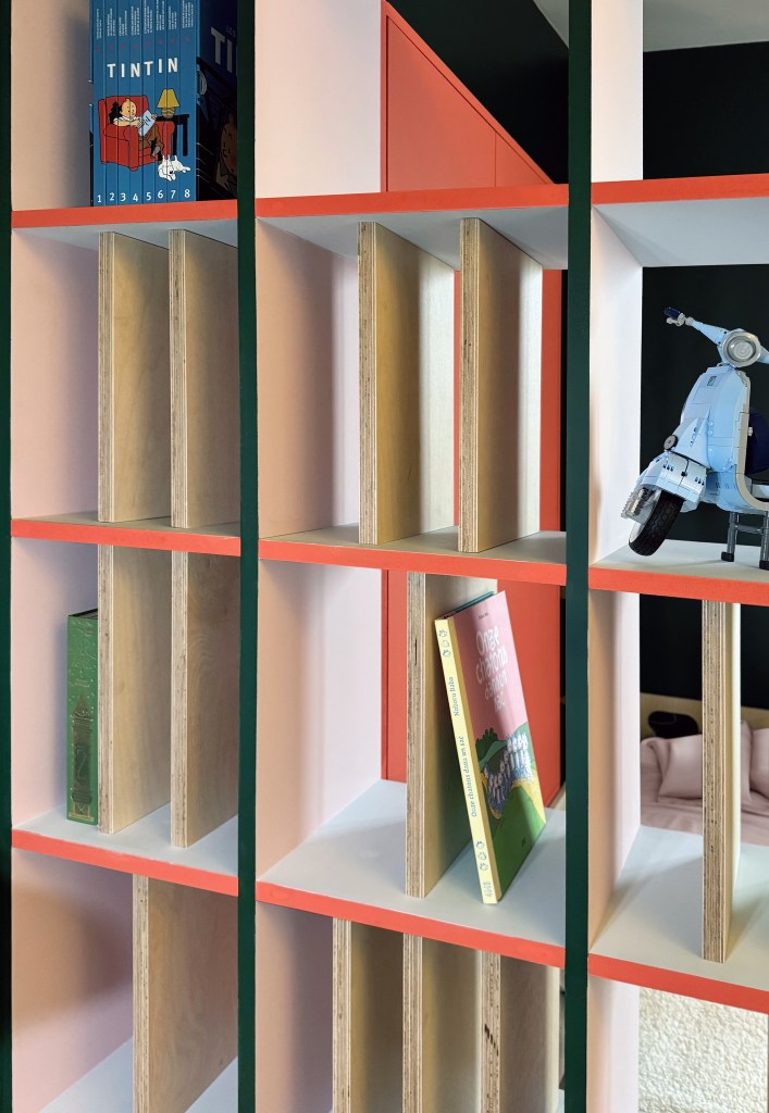 Pour le bureau des parents, grands lecteurs, deux éléments de rangement sur mesure ont été créés pour accueillir tous types de livres et rendre leur espace de télétravail beaucoup plus chaleureux et organisé .