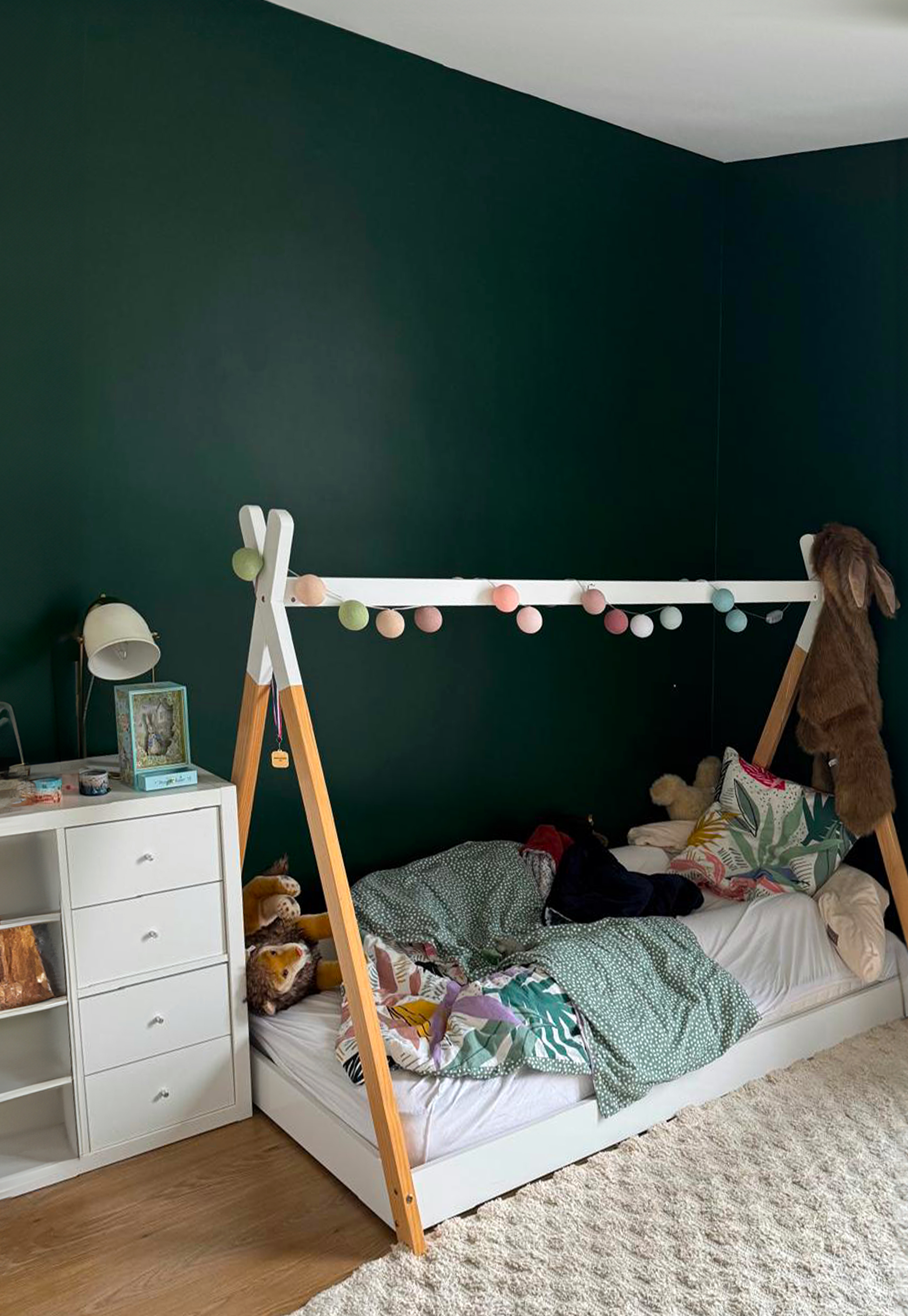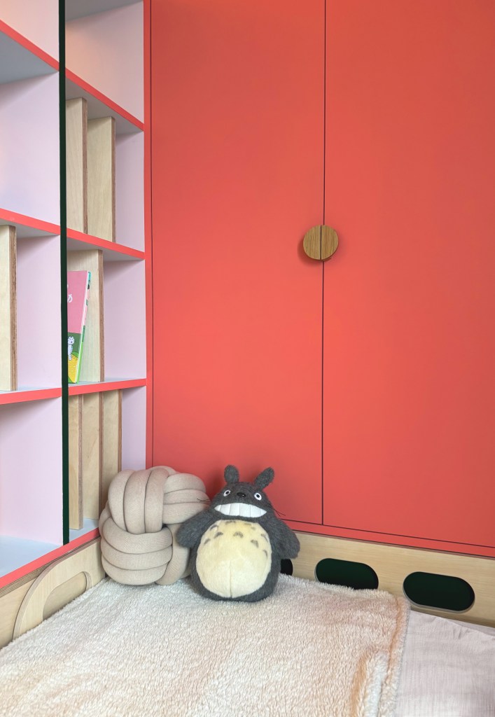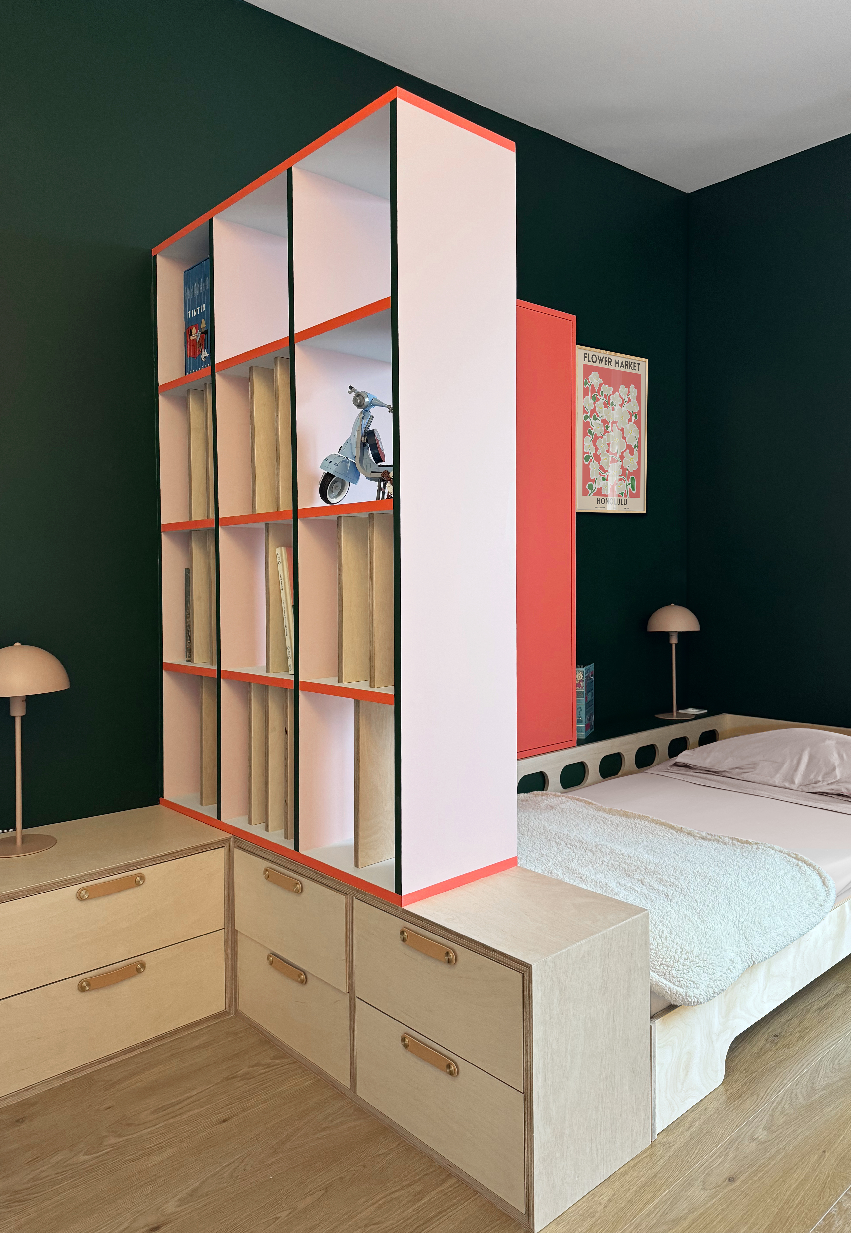 Descriptif : Pour l’arrivée de leur deuxième fille, ces parents ont souhaité que l’on repense la chambre de l’aînée pour y intégrer deux espaces de couchage, une bibliothèque, un bureau et des rangements. Ludique et ultra colorée, la bibliothèque est au centre du projet et donne le ton de la décoration. Ouverte de part et d’autre, elle a également pour fonction de séparer les espaces de couchage.